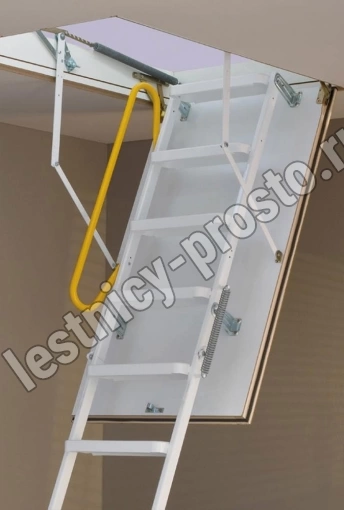 Износоустойчивая лестница для холодных помещений, приспособлена, как для частого использования так и для продолжительного простаивания. Белый цвет крышки люка (толщина 3,3 см) гармонично интегрируется в интерьер помещения и закрывается, маскируясь в один уровень с потолком.