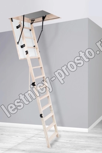 Лестница складная четырехсекционная, изготовлена из массива сосны. Термоизоляционная крышка типа "сэндвич" утеплена пенопластом толщиной 20 мм, облицована с двух сторон ДСП белого цвета.