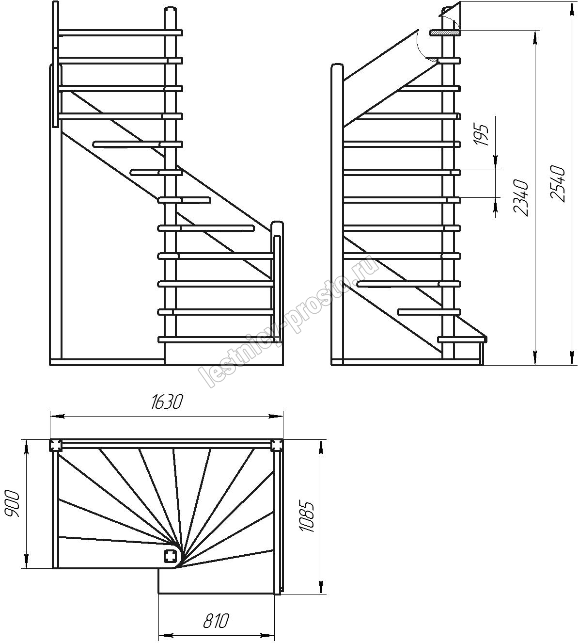 Деревянная межэтажная лестница ЛЕС-01 2340-2540 проем 1630-900, Сосна