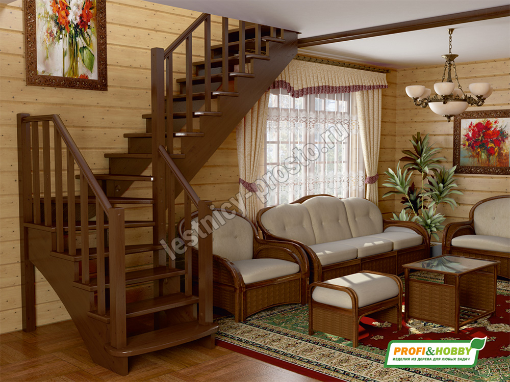 Базовый комплект включает в себя деревянные элементы лестницы и ограждения ;без какого-либо покрытия.