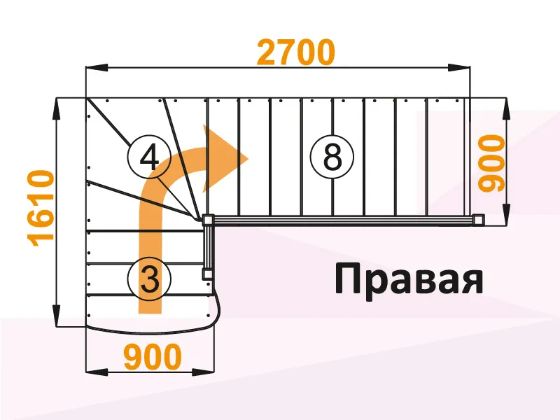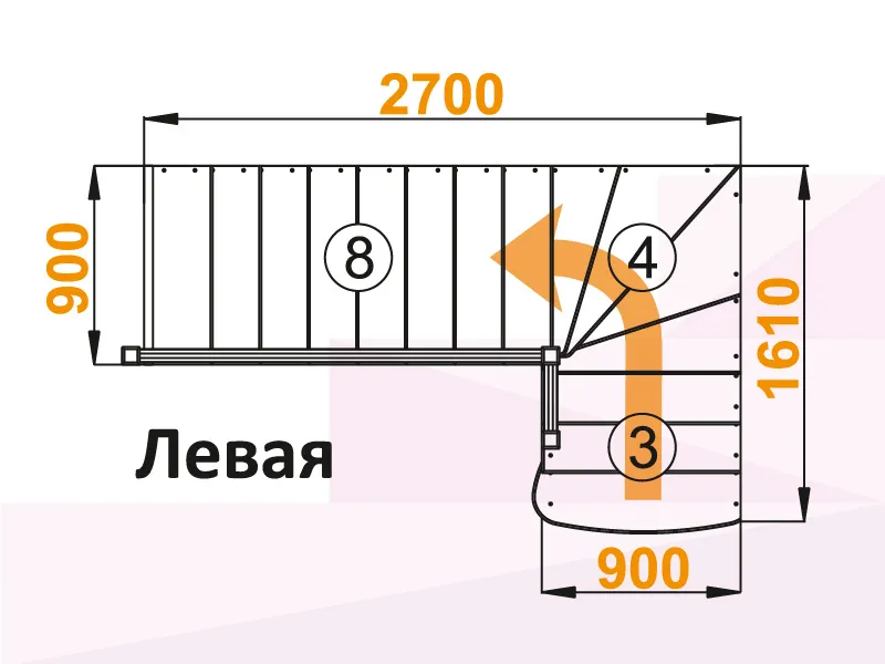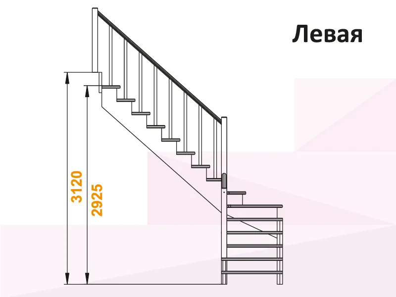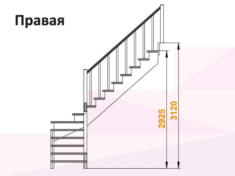 Поворот на 90 градусов выполнен с помощью 4-х забежных ступеней. Первая (нижняя) ступень лестницы - пригласительная, имеет скругленные внешние углы. Базовый цвет: