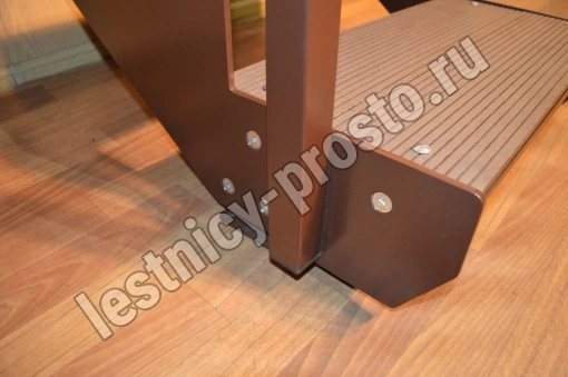 Ступени лестницы состоят из металлической рамки, обеспечивающей необходимую прочность, и покрытия из террасной доски ДПК (древесно-полимерный композит). Ступени не боятся воды и мороза, не теряют со временем свой внешний вид и не требуют ухода.